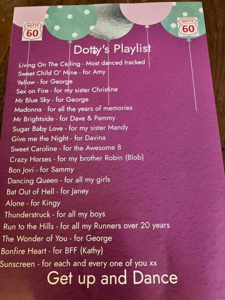 Everyone had to wear something red (why not?), arrive by 7pm and be prepared to dance – all night! I spent literally months pulling together a very personal playlist which was/is 4 hours 43 minutes long with no gaps between songs (playing in the background whilst I type). The list started with ‘The Greatest Show’ and finished with ‘Sunscreen’ and in between were a whole host of songs that were either about moments in my life, moments in other people life’s, events and about individuals.